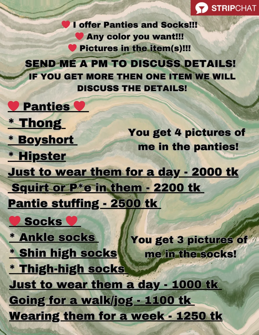 Smoking, Spanking, Striptease, Topless, Twerk, Role-playing, Camel Toe, Dirty Talk, Doggy Style, Humiliation, Masturbation, Upskirt, Tittyfuck, Gagging, Ahegao, J.O.I., Degrade myself, Degrade you, Facesitting, Flashing, Shower, Squirt, Gape, Sex Toys, Erotic Dance, Orgasm, Dildo or Vibrator, Fingering